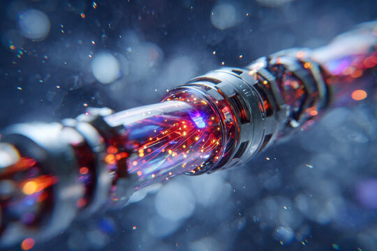 Futuristic glowing fiber optic cable transmitting vibrant data signals through transparent segments in a high-tech digital environment with blue bokeh background
