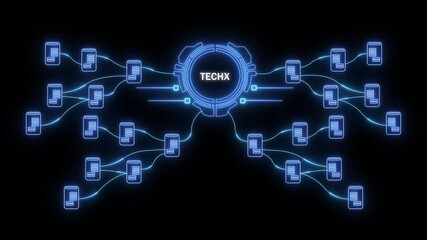 Futuristic Techx Network Diagram with Central Hub and Connected Nodes Keywords: techx, network, diagram, futuristic, technology, system, connection, data, hub, nodes, digital, abstract, glowing
