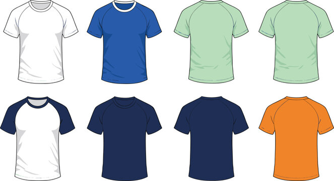 Men’s casual raglan sleeve t-shirt collection, front and back view, vector flat design, sport tee mockup, editable apparel templateMen’s casual raglan sleeve