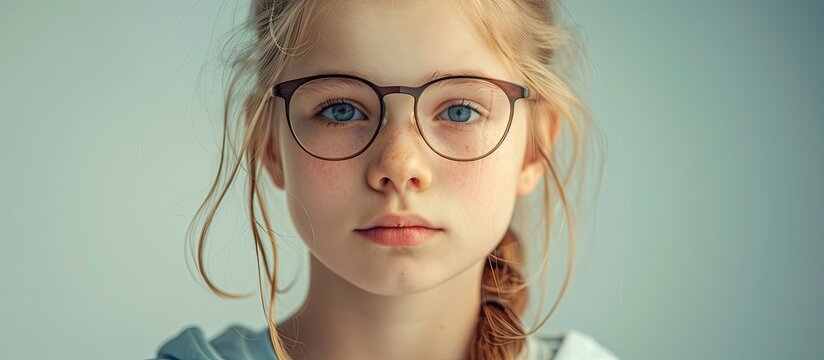 Teenage Caucasian girl wearing glasses in a studio setting with copy space image in the background