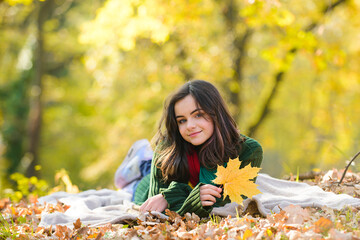 Happy teenage girl outdoor on the autumn field. Cute teenage girl lying on autumn maple leaves at fall outdoors. Beautiful fall time in nature.