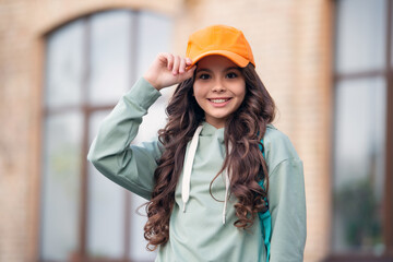 casual teen girl childhood at the street. photo of casual teen girl childhood in cap.
