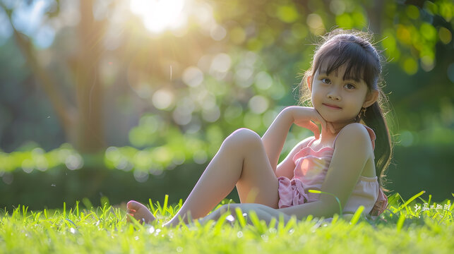 girl relax peacefully on the grass happy childhood of teen girl summer relax in park teen girl sitting outdoor childhood lifestyle of teen relax on summer lawn relaxation on lush green : Generative AI