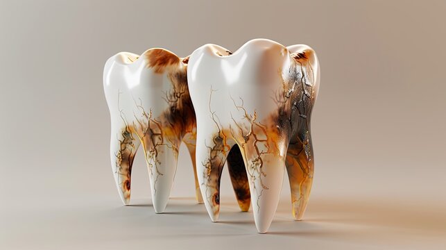 3D tooth showing stages of decay, progressive damage, white, bright lighting, educational style