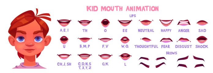 Boy kid character mouth animation cartoon vector. Sync talk english letter pronunciation construction template set with happy and sad emotion expression. Alphabet sound pack for speech generator