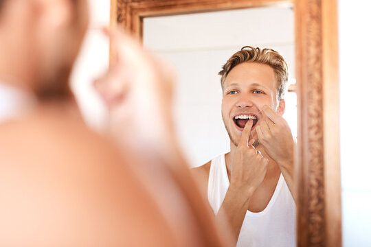 Mirror, man and flossing in bathroom for healthy gums, teeth whitening or morning routine. Dental care, wellness and hands of person in reflection for fresh breath, remove plaque or hygiene in home
