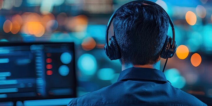 Telemarketing and CRM in action, a man in customer service engages with clients using a headset during late night work. This telemarketing professional provides advisory support and assistance in the