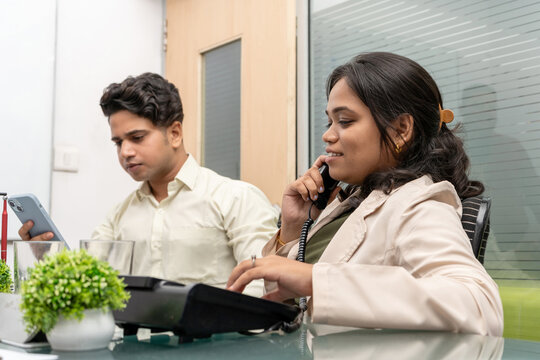 An Indian Bengali brunette young woman/telecaller in office wear is sitting on a office table in a working mood in a corporate office/bpo/call center. Indian corporate lifestyle