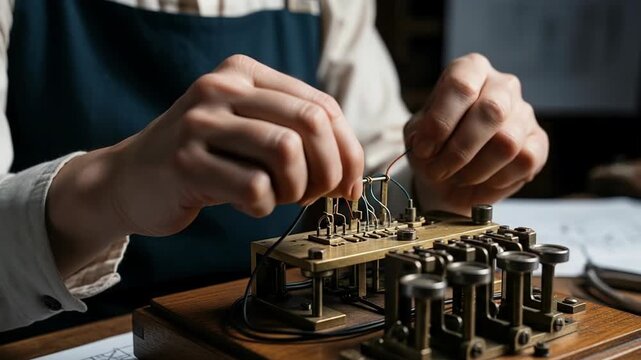 Skillful craftsmanship in assembling an early telegraph machine with intricate wiring techniques
