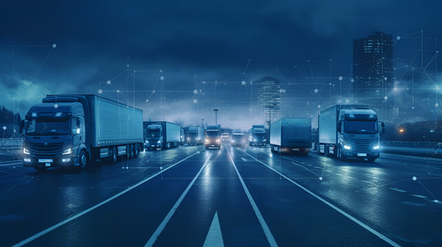 Conceptual image of trucks on a smart global network illustrating fleet management and logistics