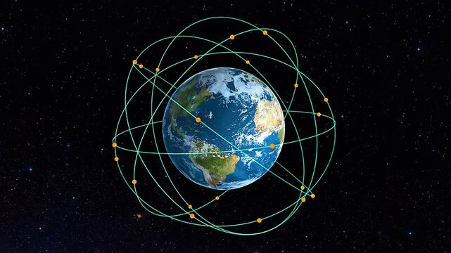 Satellite equipped with solar panels operates in low Earth orbit, actively transmitting signals for global navigation and positioning systems while providing telemetry data.