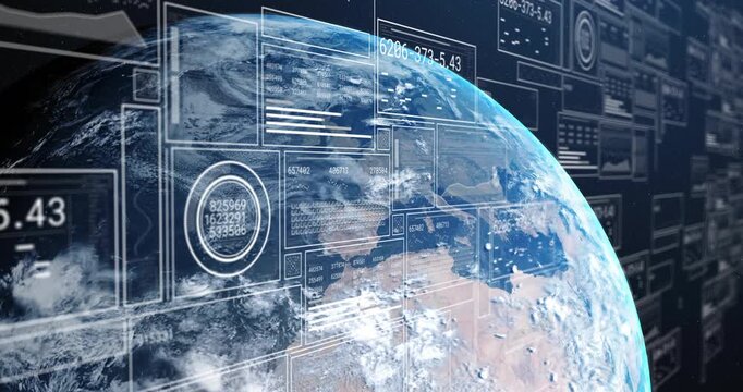 Futuristic motion graphic user interface head up display screen with Holographic Earth and digital data telemetry information display for digital background computer desktop display screen