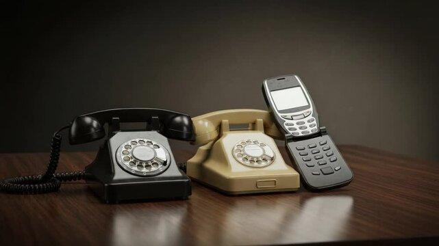 Vintage and Modern Telephones on Wooden Table Display