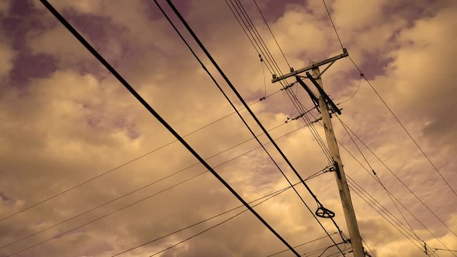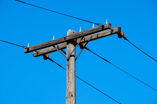 Broken electric pole damaged short circuit with spark. Wood power lines, Electric power transmission. Utility pole Electricity concept. High voltage wires, Vector illustration