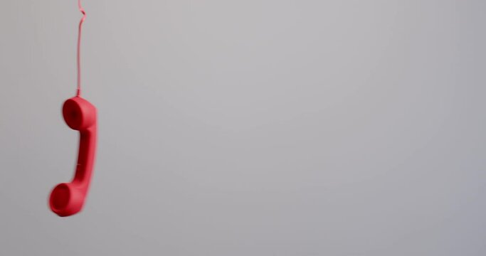 Vintage phone hanging in air after call ended. Red wire telephone receiver dangling and swinging to and fro in oscillatory motion on grey background making us worry, leaving uneasy uncertain sensation