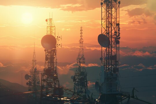 Telecommunication equipment set including satellite dish, mobile cell tower, and radio antennas isolated on white background