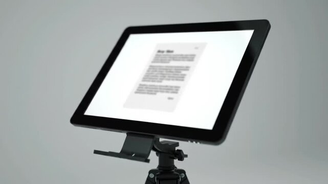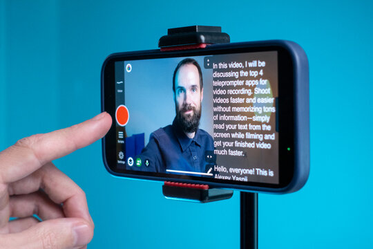 A young man shoots a video on a smartphone while reading text from a teleprompter on a screen