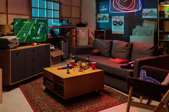 Night at Home: Three Soccer Fans Sitting on a Couch Watch Game on TV, Use Smartphone App to Online Bet, Celebrate Victory when Sports Team Wins. Friends Cheer Eat Snacks, Watch Football Play.