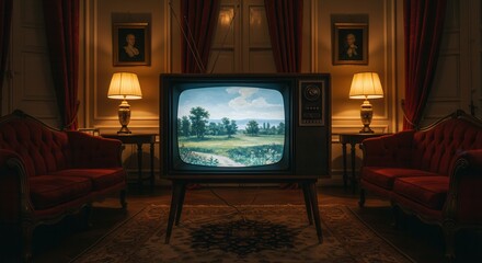 Retro cathode ray tube (CRT) monochrome television sets and classic wooden TV stand with outdated amplifier front concrete wall background. Broadcasting, news concept. Vintage old style filtered photo