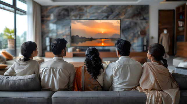 Laughing Hispanic couple sitting comfortably on sofa, engrossed in watching TV, hold remote controller, switch channels, choose their favorite show, adjust volume, relaxing together on weekend at home