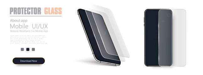 Glass screen protector or glass cover. Vector illustration of transparent tempered glass shield for mobile phone. Realistic black smartphone.