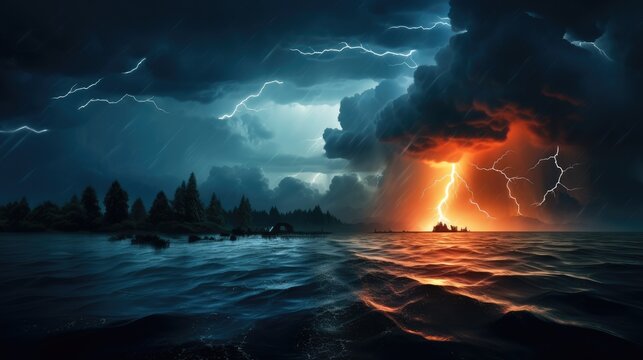 A fierce flash of lightning over the sea at night in the tempestuous sky.