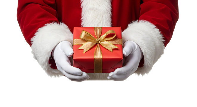Santa Claus Hands Holding Christmas Gift Box Isolated on White Background