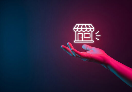 A hand presenting a glowing storefront icon, perfect for small business, retail, and e-commerce marketplace concepts