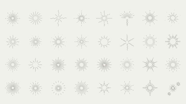 Collection of sunburst radiating light beams and vintage starburst design elements in soft gray