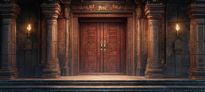 A temple entrance with massive wooden doors, covered in sacred carvings crisp edges