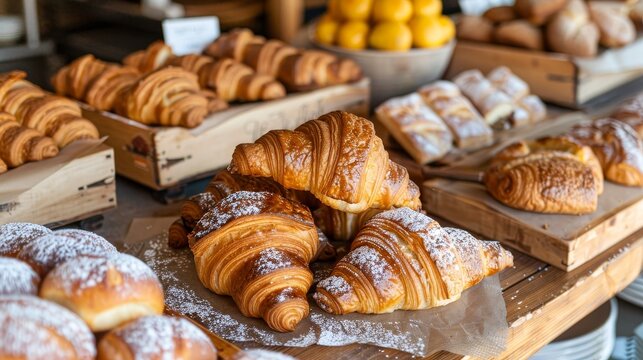 Freshly Baked Croissants and Pastries on Bakery Counter, Tempting Display.