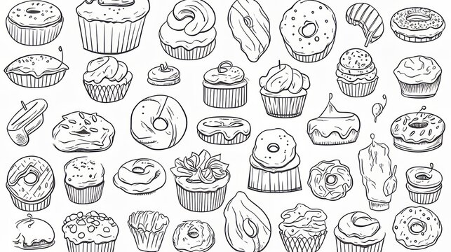 Various sweet desserts, creating a delightful and visually appealing arrangement. Line art style illustration pattern background.