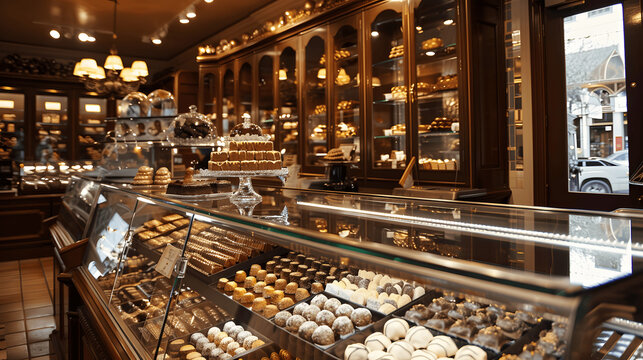 An elegant candy store display featuring an array of glass jars filled with colorful sweets and confections, inviting a sense of nostalgia and sweetness.