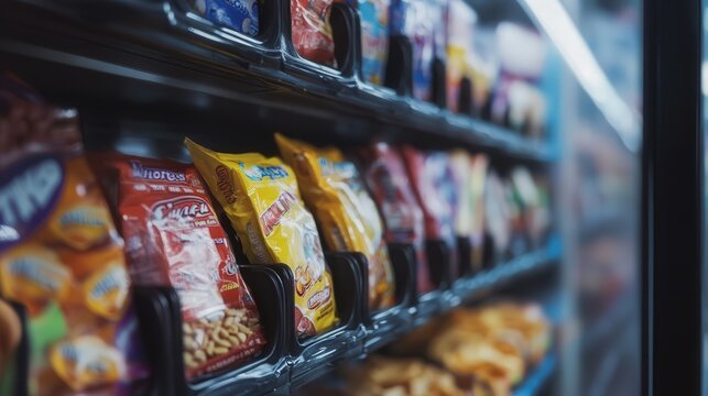 vending machine filled with candy bars and chips, showcasing a colorful and tempting selection of treats