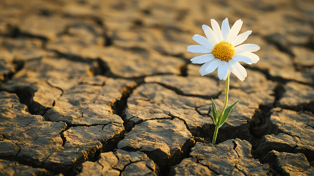 symbolic close up of a single resilient purple wildflower bravely blooming amidst dry cracked arid earth representing nature s tenacity and hope in harsh drought conditions