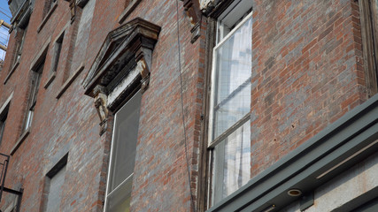 Close up exterior DX establishing photo of old vintage architecture style apartment building window day time outside. Brooklyn tenement style architecture design construction