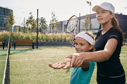 Female tennis coach teaches little girl to play tennis on grass court. Tennis lesson for a child