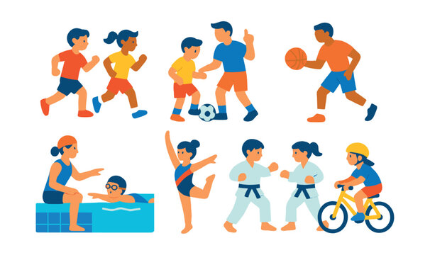 Flat vector icons of youth sports: kids running, soccer practice, basketball training, swimming lesson, gymnastics, martial arts, tennis coaching, cycling club.
