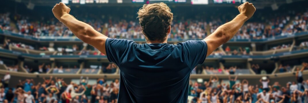 Athletic man raises arms in celebration amidst cheering crowd at indoor sports arena. Spectators excitement, anticipation for tennis championship event. High-resolution moment of triumph.