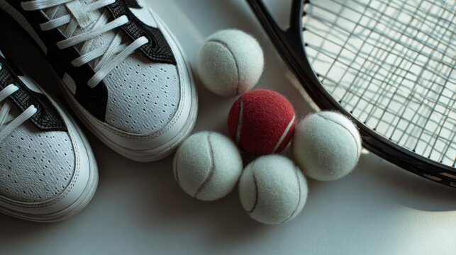 Sporty Tennis Equipment: Shoes, Tennis Balls and Racket Still Life Composition