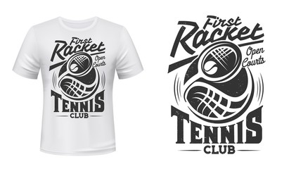 Tennis tournament badge design with racket and ball on green grass court.
