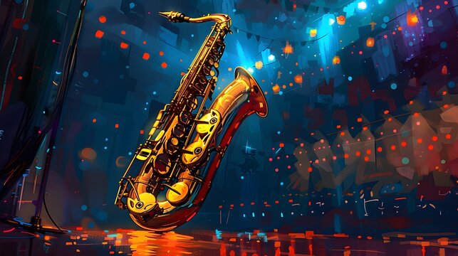 A colorful abstract illustration of a gold tenor saxophone with musical notes