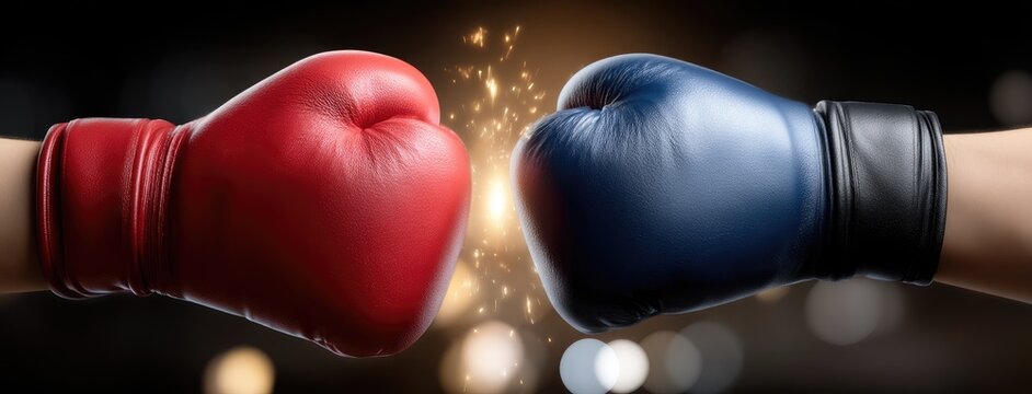 Boxing gloves collide in a tense showdown between red and blue fighters during an electrifying match in a ring surrounded by cheering fans and bright lights