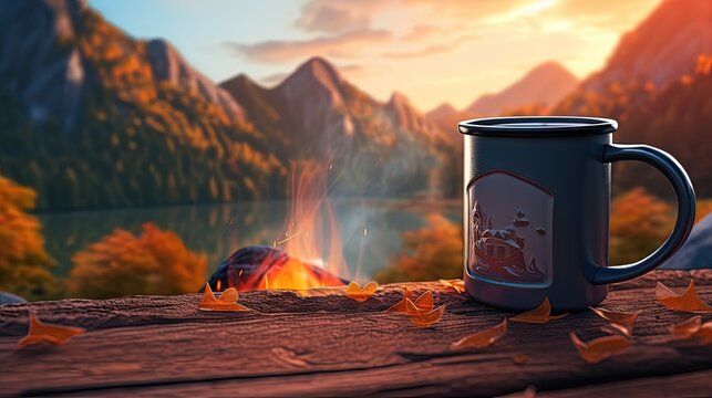 Blank enamel coffee cup mockup, camping mug in  forest.