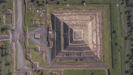 Aerial view of pyramids in ancient mesoamerican city of Teotihuacan, Pyramid of the Moon, Valley of Mexico from above, Central America, 4k UHD