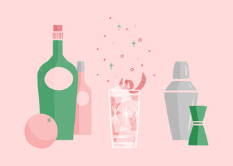 Hand drawn set of alcoholic drinks. Bottle of rum, cognac, tequila, whiskey. Vector beverage illustration, ink sketch