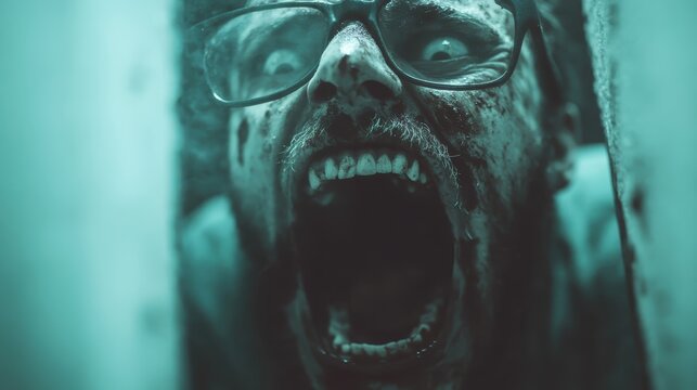 A horrifying close-up of a terrifying figure screaming with wide eyes, surrounded by an eerie dim green light, evoking intense fear and shocking terror.