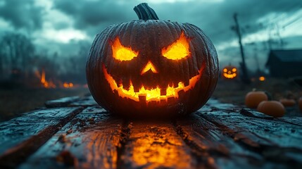 Large terrifying Halloween pumpkin glowing on cracked wooden planks under a dark sky
