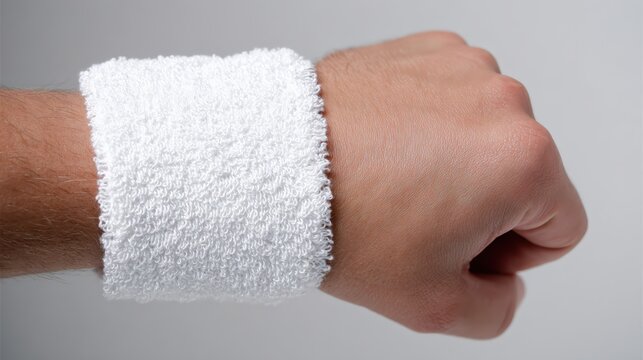 Close up of a hand wearing a white terrycloth wristband against a neutral background