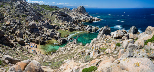 Rocky coastline of Capo Testa in Sardinia, with turquoise waters, granite cliffs, green vegetation and cloudless sunny sky